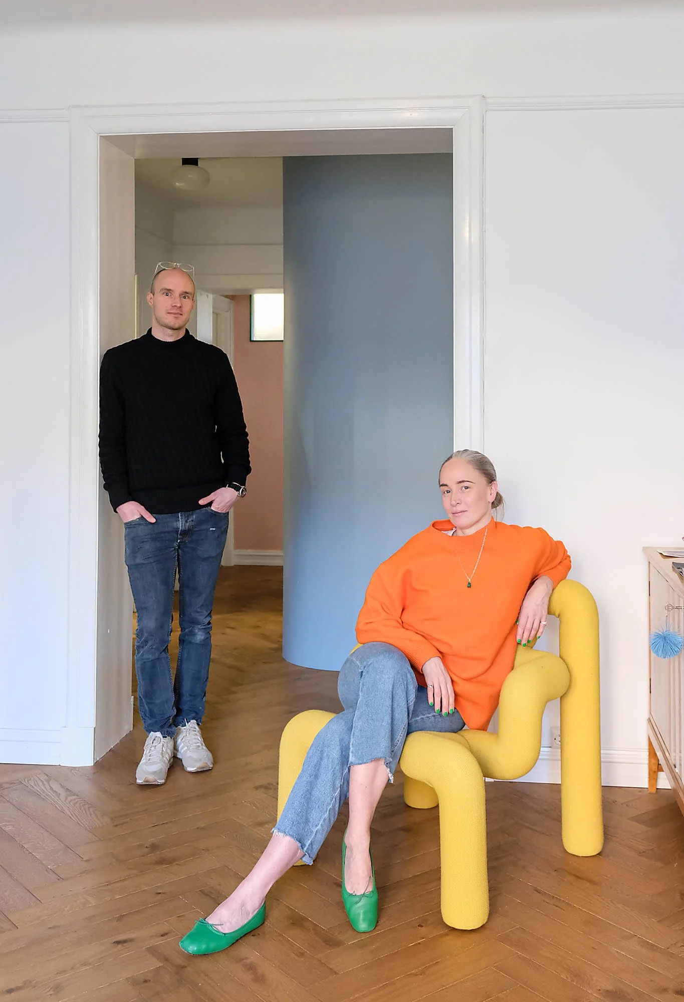 Now, flower might be a bit of a stretch - but once my eyes have adjusted to the warmth of the Dijon mustard entrance hall, the massive bright blue curve ahead fixes my gaze and transports me from what could have been an apartment in 1930’s Paris or Antwerpen today, and on to something altogether more, how do you say it - fun…? The curve (actually a closet on one side and a home office on the other) was, according to Anette, an ingenious solution by Lars that satisfied their need for more storage space and a home-office). I can’t help but think of it as a flower - or a stem at any rate, rounded, organic, it occupies what feels like the centre of the apartment, a nexus, the rooms like petals on a flower, all tied together by this one «to die for» piece of furniture, both elegant and functional! Just like a flower no?